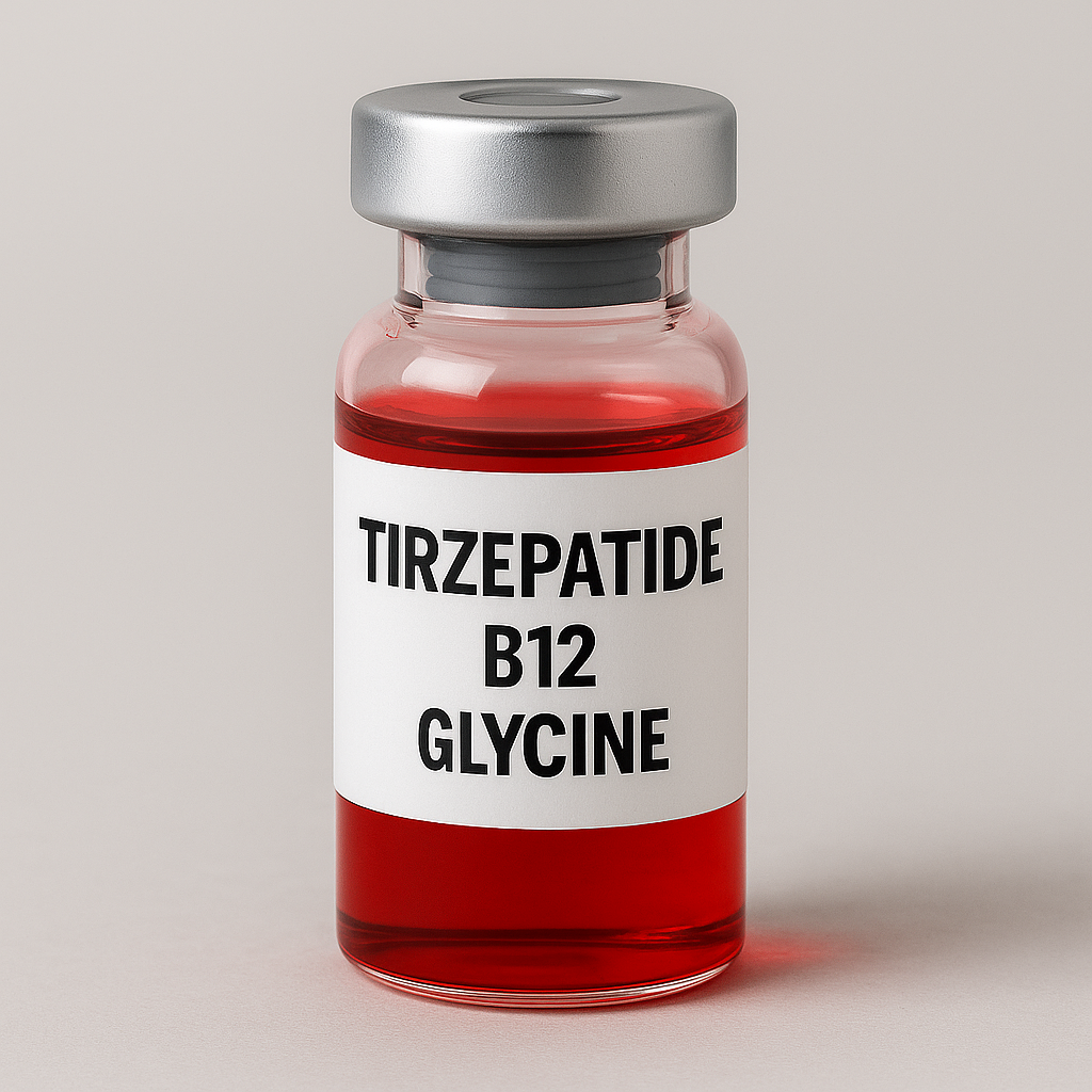 Compounded Tirzepatide combined with B12 for energy and Glycine for muscle retention in a vial with supplies included.